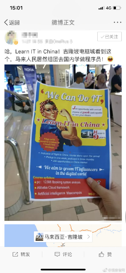 近日,有位在馬來西亞旅行的中國游客在微博上發(fā)布了一張有趣的宣傳單。并配上感言,馬來人民居然組團去國內學程序猿! 內容是一家馬來西亞中介機構提供馬來人到中國去學習中國AI技術的服務。沒錯,是一張留學培訓宣傳單。但乍一看, 還以為健身房傳單,難道設計師從藍翔嗎。內容到是較吸引人,介紹中不光強調0基礎速成,而且還以—年入50萬馬幣以及3年就能買房為噱頭!中國作為人工智能領域的“新貴”,開始吸引老外組團來當程序員了!彩印宣傳單